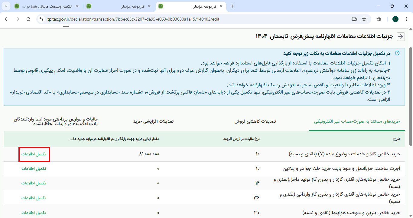 • برای بارگذاری فایل مربوط به هر ردیف، گزینه تکمیل اطلاعات را انتخاب کنید.